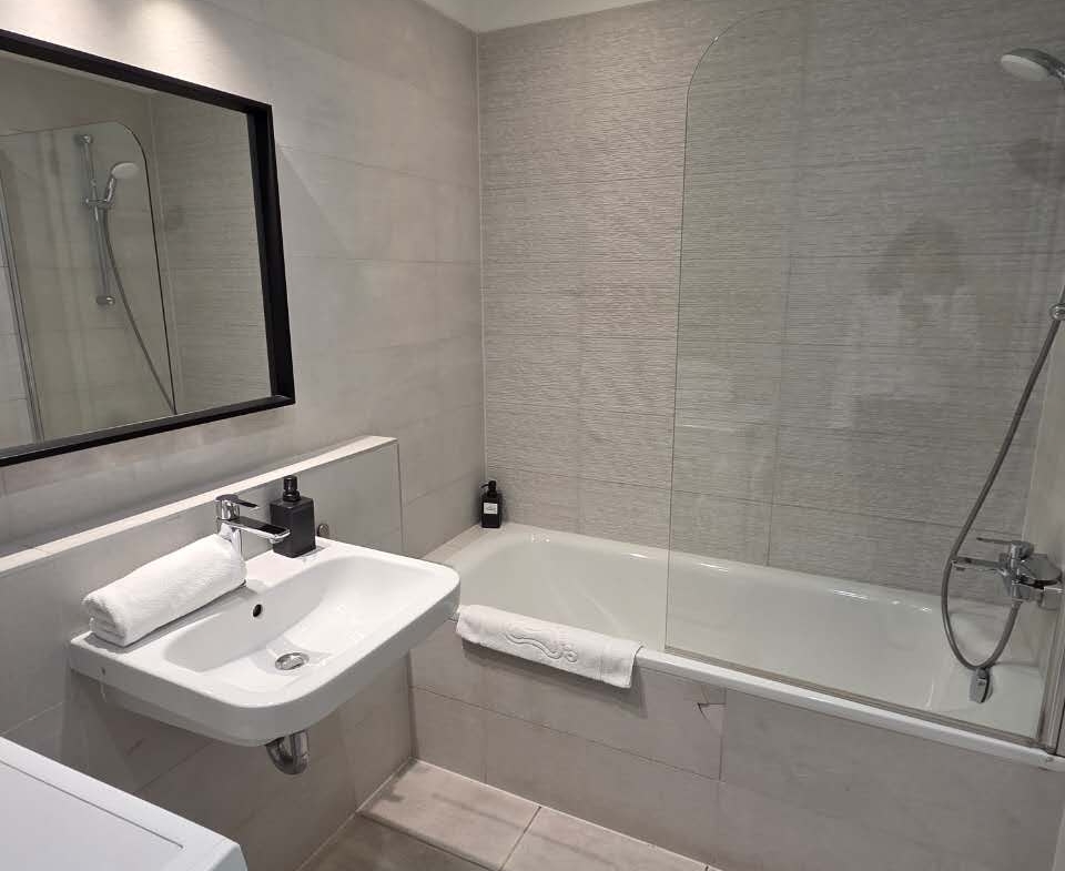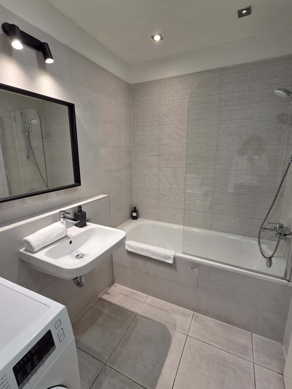 - Bathroom with bathtub and washing machine