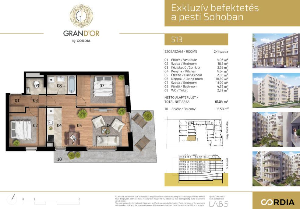 The net floor area of the property is 61,04 sqm, complemented by a spacious 15,58 sqm balcony, making the apartment highly livable and well-designed.